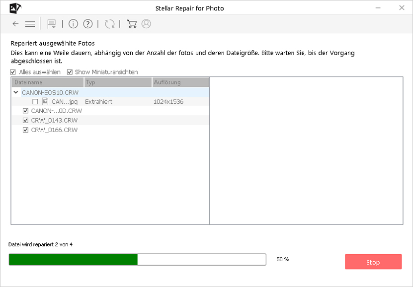 Ihre Fotos können so stark beschädigt sein, dass sie nicht mehr repariert werden können. Die fortschrittliche Stellar Photo Repair Software extrahiert die eingebetteten Thumbnails im Falle stark beschädigter Bilddateien, ohne deren visuelle Wiedergabetreue zu beeinträchtigen.
