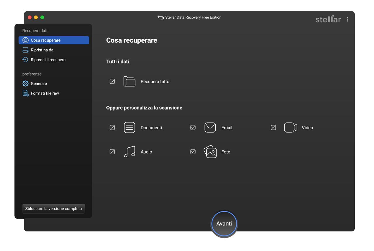 Stellar® Recupero Dati Standard per Mac è l'aggiornamento successivo all'edizione gratuita. Con l'edizione Standard, può recuperare un numero illimitato di file persi o cancellati da un sistema Mac con pochi clic.